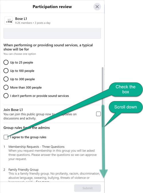 Thanks for your interest in the Bose L1 Facebook group. The group is public and anyone can join and read all the content. However, to Participate (post, reply or comment)