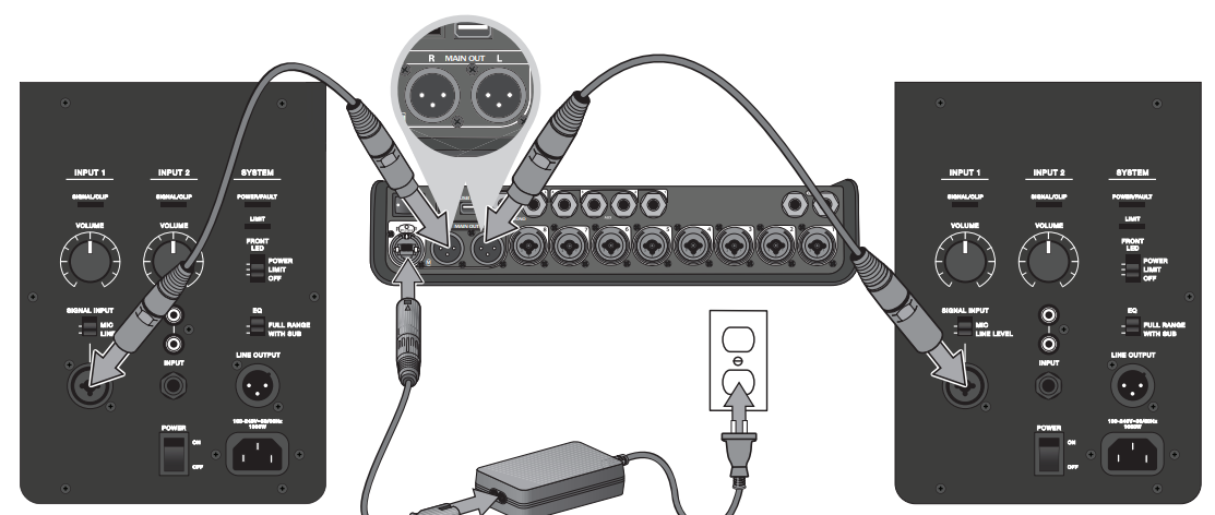 - Connect a ToneMatch* power supply to the Power port of the T4S/T8S and plug it into a live AC outlet. Refer to “Connecting the ToneMatch’ Power Supply” on page 14.