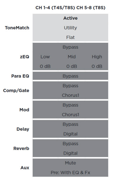 To reset your ToneMatch Mixer[1] to factory settings you can do a T4S/T8S Factory Reset (T4S/T8S only) but if you don't want to lose any saved Scenes you can load the Factory Settings Scene (T1/T4S/T8S).