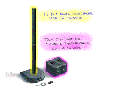 Think of the L1 Cylindrical Radiator® loudspeaker (Yellow highlight) is a single loudspeaker with 24 drivers (2.5 inch)[2] supplied by 500 watts for the L1 Classic and 250 watts for the L1 Model I. Note: the L1 Model I provides the same audible output. It is just more efficient than the L1 Classic.