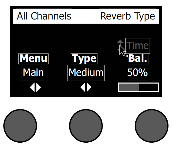 The Reverb Type function allows you to select the type of reverb that is applied to all input channels. The decay time (Time) and balance (Bal) are adjustable. Balance controls the ratio of early-to-late reflections.