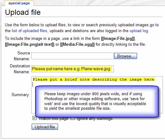 4. Click the link and the wiki will take you to the image upload page with the 'Destination filename' already filled in with the name you specified in the tag. (Where it says "Please put a name here e.g. Plane-wave.jpg in the image below).