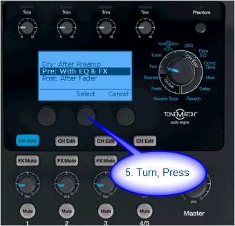 7. Aux output — User-definable analog output. Can be configured for a pre-fader, post-EQ, and effects or post fader output. Accepts ¼" TRS balanced or TS unbalanced cables