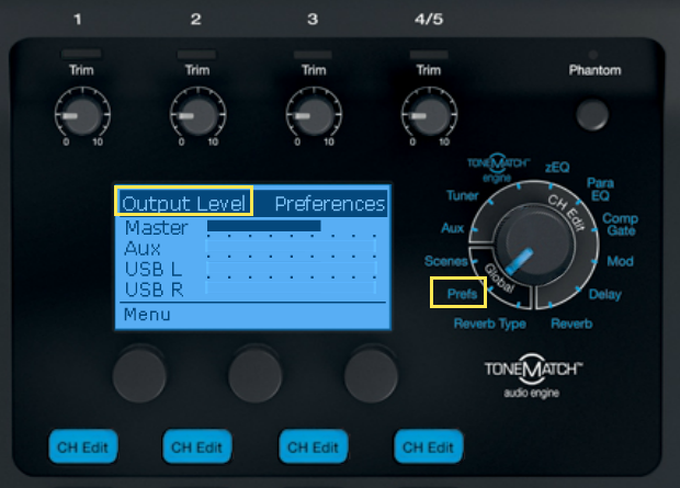 These instructions apply if you are using third party mixer and are connecting to the T1 ToneMatch Audio Engine Channel 4/5 using the Analog Inputs on the back. Note: If you are connecting by USB from a computer or tablet you do not have to set the trim control, and there trim light will be inactive.