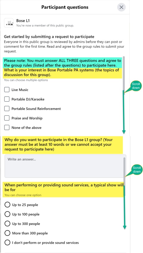Thanks for your interest in the Bose L1 Facebook group. The group is public and anyone can join and read all the content. However, to Participate (post, reply or comment)