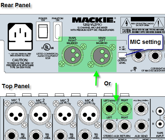 Use the XLR - or - ¼ inch phone jack (Tip-Sleeve) outputs to