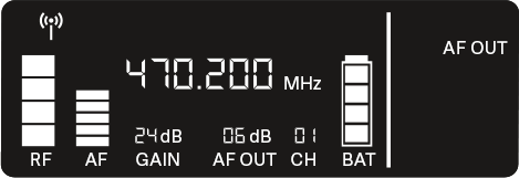 Under the AF OUT menu item, you can set the level of the audio signal coming from the receiver’s audio outputs (AF out Bal/Unbal). This audio signal can be output to a mixing console or an amplifier, for example.