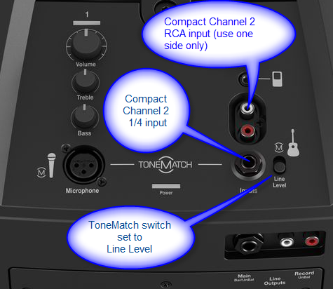 Connect TO the Compact Channel 2 volume straight up (12:00 o'clock to 1:00 o'clock) for good results. You can turn it up higher, but if you see the light on the Compact solid red (flickers of red are okay) or you hear distortion, turn down the volume on the Compact.