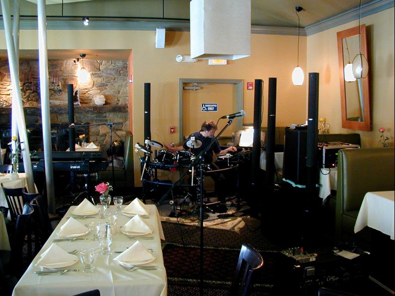 We set up five of the Village Hall systems at the “Cosmopolitan Grille”, a local fancy/schmancy restaurant in Framingham that actually had great food. Some of our senior executives knew the owner and we rented it for a day to test the system. It was the usual amplified quartet but by this time I had purchased a good set of Roland VDrums for use with the system. Two systems were used for the Roland drums and they sounded simply great to me. It was here that we learned how limited 2-channel “stereo” was for any instrument. It was very clear that the kit only sounded spatial and full in front of it (between the two speakers). Especially the snare (what else is there anyway?) sounded unclear off to the side. Shortly after this, we started using a mono system for drums with much better results. So, anyway, you can see it was set up for a typical nightclub in a “dinner theater” format. Keys and guitar were on the perimeter (stage right and left respectively) with Jeff Majeau’s fretless Renaissance bass next to the drums.