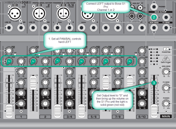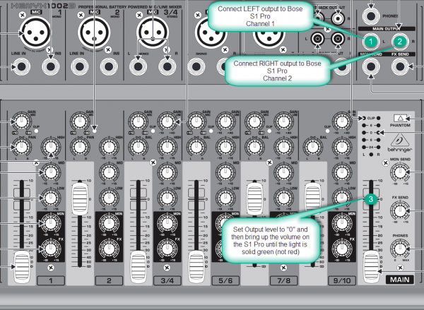 - Set the Behringer MAIN output at "0" bring up the volume on the S1 Pro until you see solid green but not red on the channel LED.