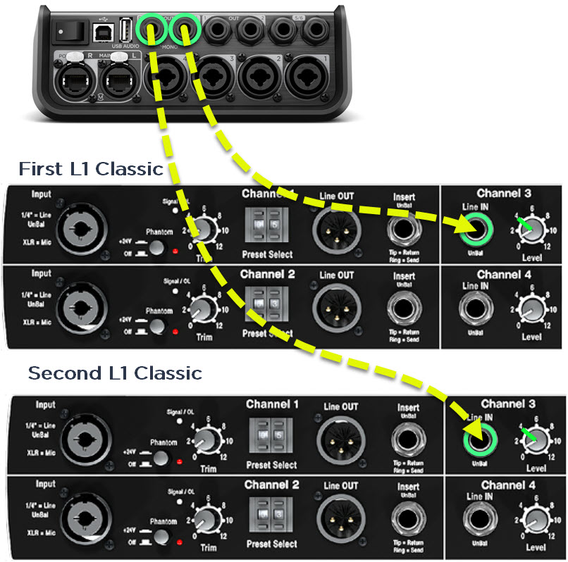 - T4S ToneMatch mixer Left output to the Left L1 Classic/L1 Model I Channel 3